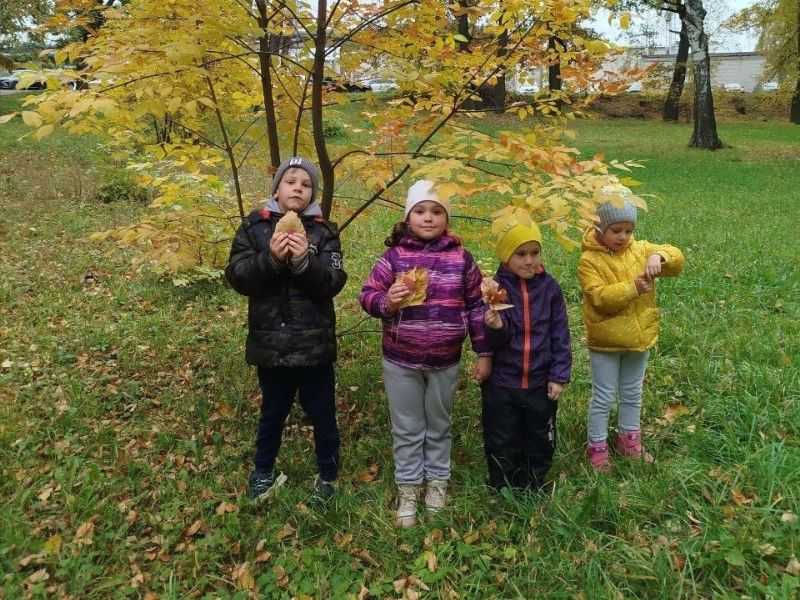 Дети с интересом наблюдали и рассматривали листочки на деревьях, собирали красивый осенний букет из листьев, играли в игру "Найди берёзку", с удовольствием побегали на свежем воздухе.