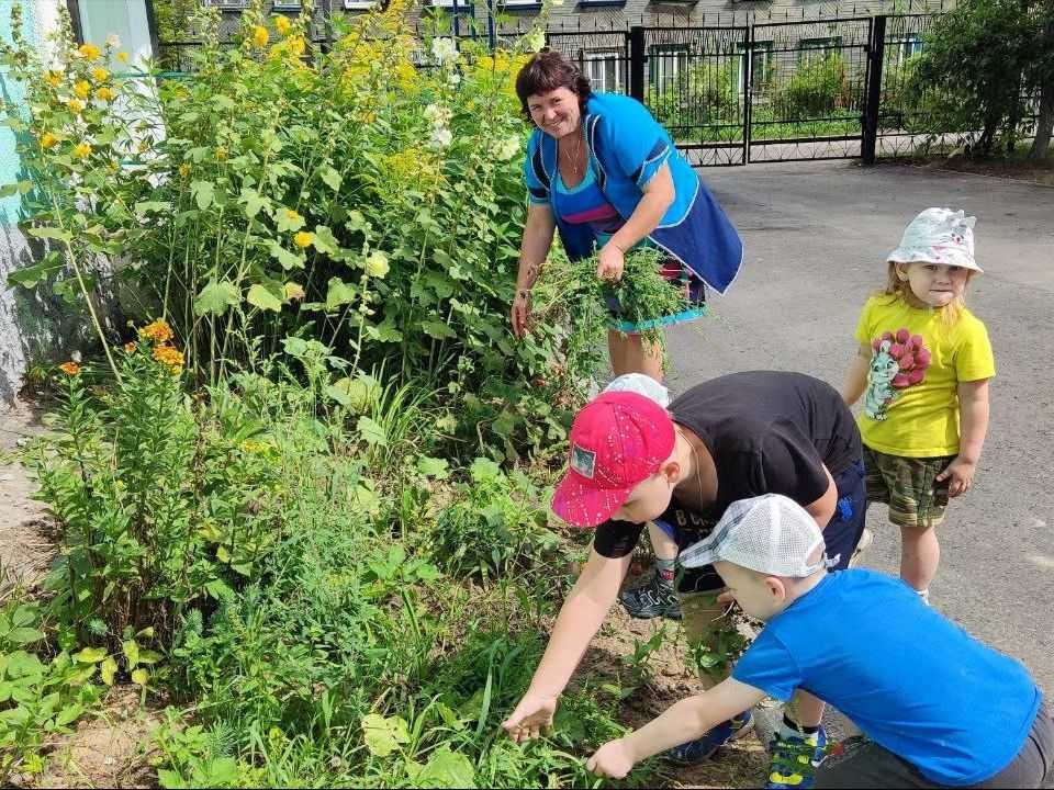 Во время прогулок воспитанники младшей группы ГБУ "СРЦН Балахнинского муниципального округа" совместно с воспитателями ухаживают за растениями на клумбах: выпалывают сорняки, рыхлят землю, поливают цветы.