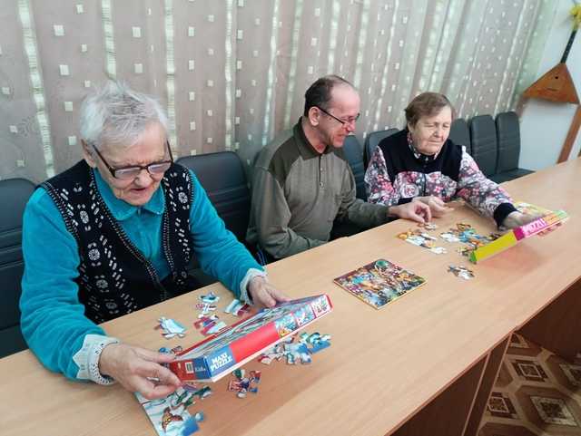 Специалист по социальной работе для получателя социальных услуг повела развивающее занятие, собирание пазлов.