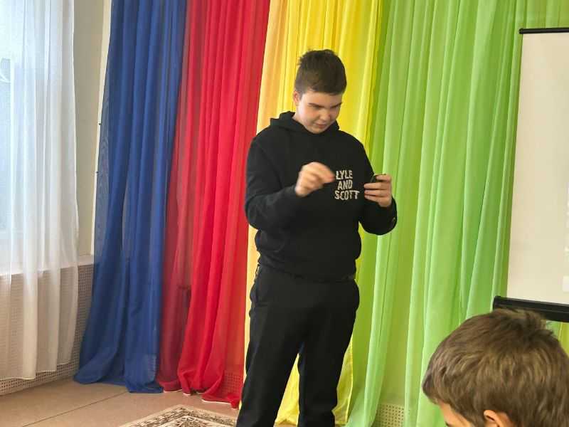 На занятиях с психологом воспитанники стационарного отделения отрабатывают навыки невербального общения: с помощью жестов и различных поз пытаются объяснить содержание карточек психологической игры «показуха».