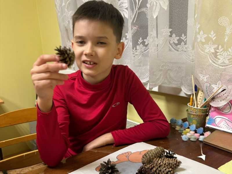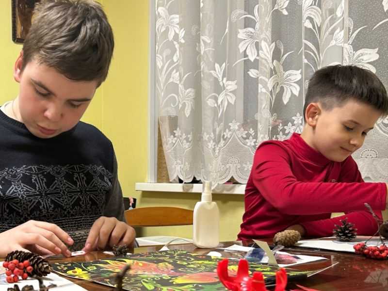 Воспитанники стационарного отделения с удовольствием создают декоративные картины с использованием шишек, рябины и листьев на занятиях трудотерапии